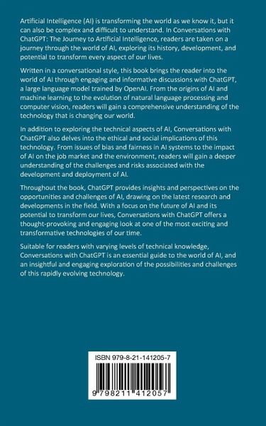 Artificial Intelligence (AI) is transforming the world as we know it, but it can also be complex and difficult to understand. In Conversations with ChatGPT: The Journey to Artificial Intelligence, readers are taken on a journey through the world of AI, exploring its history, development, and potential to transform every aspect of our lives. Written in a conversational style, this book brings the reader into the world of AI through engaging and informative discussions with ChatGPT, a large language model trained by OpenAI. From the origins of AI and machine learning to the evolution of natural language processing and computer vision, readers will gain a comprehensive understanding of the technology that is changing our world. In addition to exploring the technical aspects of AI, Conversations with ChatGPT also delves into the ethical and social implications of this technology. From issues of bias and fairness in AI systems to the impact of AI on the job market and the environment, readers will gain a deeper understanding of the challenges and risks associated with the development and deployment of AI. Throughout the book, ChatGPT provides insights and perspectives on the opportunities and challenges of AI, drawing on the latest research and developments in the field. With a focus on the future of AI and its potential to transform our lives, Conversations with ChatGPT offers a thought-provoking and engaging look at one of the most exciting and transformative technologies of our time. Suitable for readers with varying levels of technical knowledge, Conversations with ChatGPT is an essential guide to the world of AI, and an insightful and engaging exploration of the possibilities and challenges of this rapidly evolving technology.