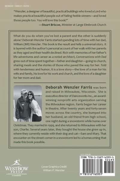 What do you do when you've lost a parent and the other is suddenly alone? Deborah Wenzler Farris started spending lots of time with her dad, William (Bill) Wenzler. This book is the result and tells a universal story. It is layered with the author's personal account of her walk with her parents as they aged and their health declined. Rich with memories of her father's life adventures and career as a noted architect, Conversations with Dad grew out of time spent together-father and daughter-going to church, sharing meals and the stories of those who paved the way for her. Told with tenderness and humor, it is a love story-the love of a man for his wife and family, his love for his work and church, and the love of a daughter for her mom and dad. "Wenzler, a designer of beautiful, practical buildings who loved a Lord who makes practical beautiful people out of failing feeble sinners-and loved those people too. You will love this book!" -Stuart Briscoe, Minister at Large Elmbrook Church
