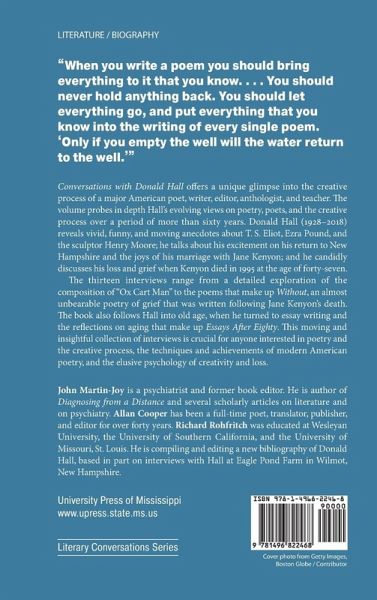 Conversations with Donald Hall offers a unique glimpse into the creative process of a major American poet, writer, editor, anthologist, and teacher. The volume probes in depth Hall's evolving views on poetry, poets, and the creative process over a period of more than sixty years. Donald Hall (1928-2018) reveals vivid, funny, and moving anecdotes about T. S. Eliot, Ezra Pound, and the sculptor Henry Moore; he talks about his excitement on his return to New Hampshire and the joys of his marriage with Jane Kenyon; and he candidly discusses his loss and grief when Kenyon died in 1995 at the age of forty-seven. The thirteen interviews range from a detailed exploration of the composition of "Ox Cart Man" to the poems that make up Without, an almost unbearable poetry of grief that was written following Jane Kenyon's death. The book also follows Hall into old age, when he turned to essay writing and the reflections on aging that make up Essays after Eighty. This moving and insightful collection of interviews is crucial for anyone interested in poetry and the creative process, the techniques and achievements of modern American poetry, and the elusive psychology of creativity and loss.