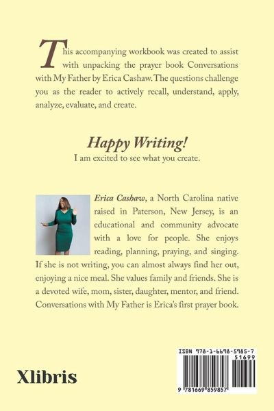 This accompanying workbook was created to assist with unpacking the prayer book Conversations with My Father by Erica Cashaw. The questions challenge you as the reader to actively recall, understand, apply, analyze, evaluate, and create. Happy Writing! I am excited to see what you create.