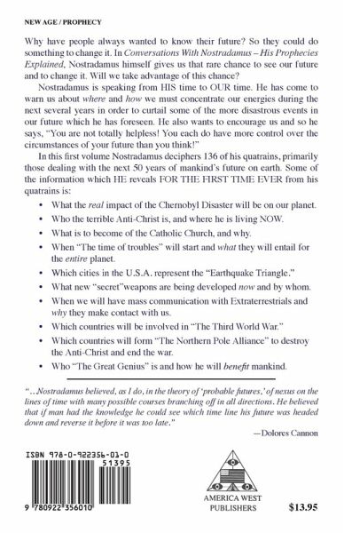 Why have people always wanted to know their future? So they could do something to change it. In this book Nostradamus himself gives us that rare chance to see our future and to change it. Will we take advantage of this chance? Nostradamusi is speaking from HIS time to OUR time. He has come to warn us about where and how we must concentrate our energies during the next several years in order to curtail some of the more disastrous events in our future which he has foreseen. He also wants to encourage us and so he says, "You're not totally helpless! You each do have more control over the circumstances of you future than you think!" In this first volume Nostradamus deciphers 136 of his quatrains, primarily those dealing with the next 50 years of mankind's future on earth. Some of the information which HE reveals FOR THE FIRS TIME EVER from his quatrains is: What the real impact of the Chernoble Disaster will be on our planet. Who the terrible Anti-Christ is, and where he is living NOW. What is to become of the Catholic Church, and why. When "the time of troubles" will start and what they will entail for the entire planet. Which cities in the U.S.A. represent the "Earthquake triangle." What new secret weapons are being developed now and by whom. When we will have mass communication with Extraterrestrials and why they make contact with us. Which countries will be involved in the Third World War." Which countries wil form "The Northern Pole Alliance" to destroy the Anti-Christ and end the war. Who "The Great Genius" is and how he will benefit mankind.