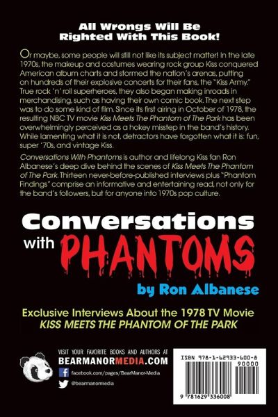 All Wrongs Will Be Righted With This Book! Or maybe, some people will still not like its subject matter! In the late 1970s, the makeup and costumes wearing rock group Kiss conquered American album charts and stormed the nation's arenas, putting on hundreds of their explosive concerts for their fans, the "Kiss Army." True rock 'n' roll superheroes, they also began making inroads in merchandising, such as having their own comic book. The next step was to do some kind of film. Since its first airing in October of 1978, the resulting NBC TV movie Kiss Meets The Phantom of The Park has been overwhelmingly perceived as a hokey misstep in the band's history. While lamenting what it is not, detractors have forgotten what it is: fun, super '70s, and vintage Kiss. Conversations With Phantoms is author and lifelong Kiss fan Ron Albanese's deep dive behind the scenes of Kiss Meets The Phantom of The Park. Thirteen never-before-published interviews plus "Phantom Findings" comprise an informative and entertaining read, not only for the band's followers, but for anyone into 1970s pop culture. About the Author Ron Albanese first heard of Kiss in 1976, when a fellow first grader sang "I Want You" to him. He would hear them directly for the first time in the summer of 1977, when his mother included the band's Rock and Roll Over album in one of those "choose 10 8-tracks for a penny" deals. He would request she play it whenever they were driving around in her Cadillac. Like so many Kiss fans, his eyes were glued to the TV at 8 p.m. on October 28, 1978, to watch their TV movie Kiss Meets The Phantom of The Park. Turning up the 19-inch Magnavox console as loud as it would go, Ron was mesmerized. At its conclusion, he spontaneously made a giant Kiss logo with his hands in his family's recreation room shag carpet, and went to bed a now-permanent member of the Kiss Army. Years later, after becoming a professional writer, and wanting to create a book related to "the hottest band in the world," Kiss Meets … immediately came to mind. Ron did research, conducted interviews, and then took an extended break as other things in his life started happening, such as starting a family and a children's entertainment business. Years later, he came across the interview tapes, and decided to put them "out there" --- the result is in your hands!