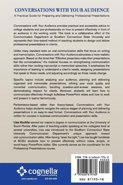 Conversations with Your Audience: A Practical Guide for Preparing and Delivering Professional Presentations provides practical and accessible advice to college students and pre-professionals on how to present effectively in a work environment. This book is a collaborative effort of the Communication Department at Southern Connecticut State University and represents their time-tested method of teaching students to design and deliver professional presentations to clients. Unlike many standard texts on oral communication skills that focus on writing and memorization, Conversations with Your Audience advocates a more realistic, audience-centered approach. Based on the tenet that effective presenters make their presentations feel like conversations, the material focuses on audience engagement and strengthening communication skills rather than on reciting manuscript or memorized speeches. Specific topics include analyzing and adjusting to your audience, planning and delivering organized and memorable presentations, refining your vocal quality and nonverbal communication, handling question-and-answer sessions, demonstrating respect for clients, creating effective visual aids, and working and presenting in groups. Performance-based rather than theory-based, Conversations with Your Audience helps students navigate the various stages of planning and delivering presentations in an easy-to-read format.