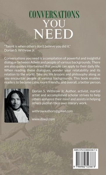 Conversations You Need is a compilation of powerful and insightful dialogue between Adwin and people of various backgrounds. As Adwin shares his philosophical insights and experiences, readers are inspired to reflect on their lives and gain a deeper understanding of themselves and their world. Through his interactions with people of various backgrounds and perspectives, readers will explore the complexities of human existence and uncover profound truths. This book enables readers to become calm, ambitious, more friendly, and, overall, better people. Whether seeking guidance, inspiration, or simply a moment of contemplation, this book offers invaluable wisdom that will resonate long after the final page is turned. Each dialogue is crafted with simplicity and clarity, making the book accessible to readers of all ages and backgrounds. Intertwined are quotes that people can apply to their daily lives.