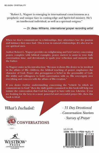 When we don't communicate in relationships, they oftentimes lose the passion and intimacy they once had. This is true in natural relationships. It's also true in our spiritual ones. Author Robert L. Wagner provides an enlightening and brief survey concerning prayer, complete with biblical examples, prayer starters to assist in your daily conversation time, and devotionals to spark your reflection and maturity with the Father. As Wagner states in his introduction: "Because it shows His desire to be involved in the affairs of His children; the biblical teaching of prayer emphasizes the character of God. Prayer also presupposes a belief in the personality of God, His ability and willingness to hold conversation with us, His sovereignty over everything and concern with the affairs of His creation." If you desire further understanding concerning the "vehicle by which we communicate to God," then the daily guides contained in this book will help you initiate the conversation that God has longed to have with you. Likewise, if you are looking for the keys to a more powerful and successful prayer life, then this book is ideal.
