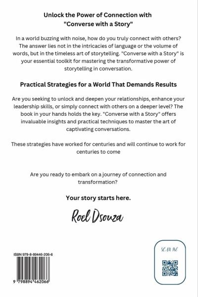 Unlock the Power of Connection with "Converse with a Story" In a world buzzing with noise, how do you truly connect with others? The answer lies not in the intricacies of language or the volume of words, but in the timeless art of storytelling. "Converse with a Story" is your essential toolkit for mastering the transformative power of storytelling in conversation. Practical Strategies for a World That Demands Results Are you seeking to unlock and deepen your relationships, enhance your leadership skills, or simply connect with others on a deeper level? The book in your hands holds the key. "Converse with a Story" offers invaluable insights and practical techniques to master the art of captivating conversations. These strategies have worked for centuries and will continue to work for centuries to come Are you ready to embark on a journey of connection and transformation? Your story starts here. ROEL DSOUZA