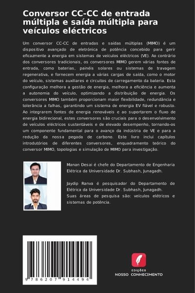 Um conversor CC-CC de entradas e saídas múltiplas (MIMO) é um dispositivo avançado de eletrónica de potência concebido para gerir eficazmente a energia em sistemas de veículos eléctricos (VE). Ao contrário dos conversores tradicionais, os conversores MIMO gerem várias fontes de entrada, como baterias, painéis solares ou sistemas de travagem regenerativa, e fornecem energia a várias cargas de saída, como o motor do veículo, sistemas auxiliares e circuitos de carregamento da bateria. Esta configuração melhora a gestão de energia, melhora a eficiência e aumenta a autonomia do veículo, optimizando a distribuição de energia. Os conversores MIMO também proporcionam maior flexibilidade, redundância e tolerância a falhas, garantindo um sistema de energia EV fiável e robusto. Ao integrarem fontes de energia renováveis e ao suportarem o fluxo de energia bidirecional, estes conversores são cruciais para o desenvolvimento de veículos eléctricos sustentáveis e de elevado desempenho, tornando-os um componente fundamental para o avanço da indústria de VE e para a redução da nossa pegada de carbono. Este livro inclui capítulos introdutórios de diferentes conversores, enquadramento teórico do conversor MIMO, topologias e simulação de MIMO para investigação.