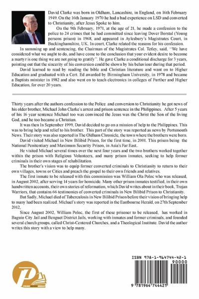 Thirty years after the author's confession to the Police and conversion to Christianity, he got news of his older brother, Michael John Clarke's arrest and prison sentence in the Philippines. After 5 years of his 16 year sentence Michael too was convinced that Jesus was the Christ the Son of the living God, and he too became a Christian. It was then in September 1999, David decided to go on a mission of help to the Philippines. This was to bring help and relief to his brother. This part of the story was reported as news by Portsmouth News. Their story was also reported in The Oldham Chronicle, the town where the brothers were born. David visited Michael in New Bilibid Prison, for the first time, in 2001. This prison being the National Penitentiary and Maximum Security Prison, in Asia's Far East.. He visited Michael several times over the next four years and the two brothers worked together within the prison with Religious Volunteers, and many prison inmates, seeking to help former criminals in their own stages of rehabilitation. The brother's vision was to equip former converted criminals to Christianity to return to their own villages, towns or Cities and preach the gospel to their own friends and relatives. The first inmate to be released with this commission was William Ola Poloc who was released in August 2002, after serving 14 years for homicide. Many other prison inmates testified, in their own handwritten accounts, their own stories of reformation, which David writes about in their book, Trojan Warriors, that contains 66 testimonies of converted criminals in New Bilibid Prison to Christianity. But Sadly, Michael died of Tuberculosis in New Bilibid Prison before their vision of bringing help to many had been realized. Michael's story was reported in the Eastbourne Herald, on 27th September 2012. Since August 2002, William Poloc, the first of these prisoner to be released, has worked in Baguio City Jail and Benguet District Jails, working with inmates and former criminals, and founded several church groups, called Christ-Centered Churches, and a Theological Institute. David the author writes this story with a view to help many.