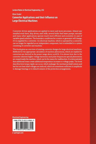 This book gives an overview of existing converter designs for large electrical machines. Methods for the appropriate calculation of machine phenomena, which are implied by converters are derived in the power range above 500kVA. It is shown how due to the converter inherent higher voltage harmonics and pulse frequencies special phenomena are caused inside the machine which can be the reason for malfunction. It is demonstrated that additional losses create additional temperature increases or voltage peaks. The book describes how torque ripple can occur, which endanger the mechanical shaft system and last but not least shaft voltages are induced, which are sometimes sufficient in amplitude to damage bearings or to disturb sensors of the protection arrangements.