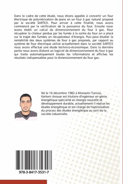 Dans le cadre de cette étude, nous étions appelés à convertir un four électrique de polymérisation de jeans en un four à gaz naturel proposé par la société SARTEX. Pour arriver à cette finalité, nous avons commencé par la vérification de la puissance du four. Ensuite nous avons établi un calcul de dimensionnement du four à gaz. Pour récupérer la chaleur perdue par les fumés à la sortie du four on a placé sur le trajet des fumées un récupérateur d énergie. Puis pour étudier la rentabilité des deux systèmes de four à gaz proposés, par rapport au système de four électrique utilisé actuellement dans la société SARTEX nous avons effectué une étude technico-économique. Dans la dernière partie nous avons élaboré un logiciel de dimensionnement du four à gaz qui traite automatiquement toutes les informations et affiches les résultats indispensables pour le dimensionnement du four gaz.