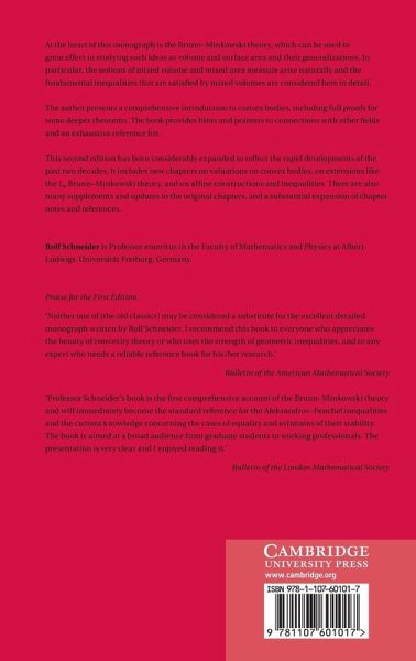 At the heart of this monograph is the Brunn-Minkowski theory, which can be used to great effect in studying such ideas as volume and surface area and their generalizations. In particular, the notions of mixed volume and mixed area measure arise naturally and the fundamental inequalities that are satisfied by mixed volumes are considered here in detail. The author presents a comprehensive introduction to convex bodies, including full proofs for some deeper theorems. The book provides hints and pointers to connections with other fields and an exhaustive reference list. This second edition has been considerably expanded to reflect the rapid developments of the past two decades. It includes new chapters on valuations on convex bodies, on extensions like the Lp Brunn-Minkowski theory, and on affine constructions and inequalities. There are also many supplements and updates to the original chapters, and a substantial expansion of chapter notes and references.