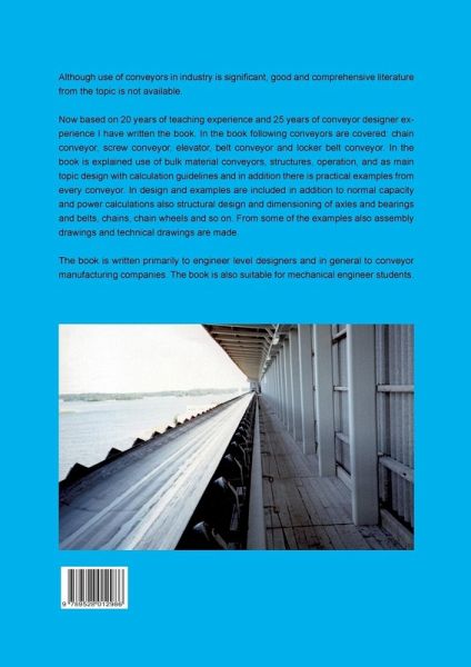 Although use of conveyors in industry is significant, good and comprehensive literature from the topic is not available.Now based on 20 years of teaching experience and 25 years of conveyor designer experience I have written the book. In the book following conveyors are covered: chain conveyor, screw conveyor, elevator, belt conveyor, and locker belt conveyor. In the book is explained use of bulk material conveyors, structures, operation, and as main topic design with calculation guidelines and in addition there is practical examples from every conveyor. In design and examples are included in addition to normal capacity and power calculations also structural design and dimensioning of axles and bearings and belts, chains, chain wheels and so on. From some of the examples also assembly drawings and technical drawings are made.The book is written primarily to engineer level designers and in general to conveyor manufacturing companies. The book is also suitable for mechanical engineer students.