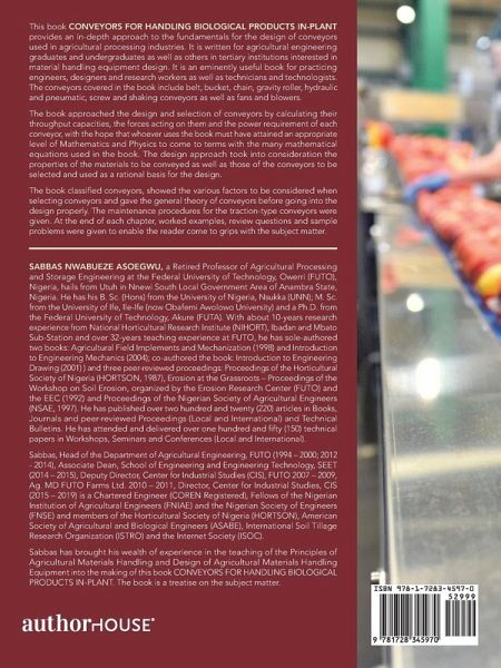 This book CONVEYORS FOR HANDLING BIOLOGICAL PRODUCTS IN-PLANT provides an in-depth approach to the fundamentals for the design of conveyors used in agricultural processing industries. It is written for agricultural engineering graduates and undergraduates as well as others in tertiary institutions interested in material handling equipment design. It is an eminently useful book for practicing engineers, designers and research workers as well as technicians and technologists. The conveyors covered in the book include belt, bucket, chain, gravity roller, hydraulic and pneumatic, screw and shaking conveyors as well as fans and blowers. The book approached the design and selection of conveyors by calculating their throughput capacities, the forces acting on them and the power requirement of each conveyor, with the hope that whoever uses the book must have attained an appropriate level of Mathematics and Physics to come to terms with the many mathematical equations used in the book. The design approach took into consideration the properties of the materials to be conveyed as well as those of the conveyors to be selected and used as a rational basis for the design. The book classified conveyors, showed the various factors to be considered when selecting conveyors and gave the general theory of conveyors before going into the design properly. The maintenance procedures for the traction-type conveyors were given. At the end of each chapter, worked examples, review questions and sample problems were given to enable the reader come to grips with the subject matter.