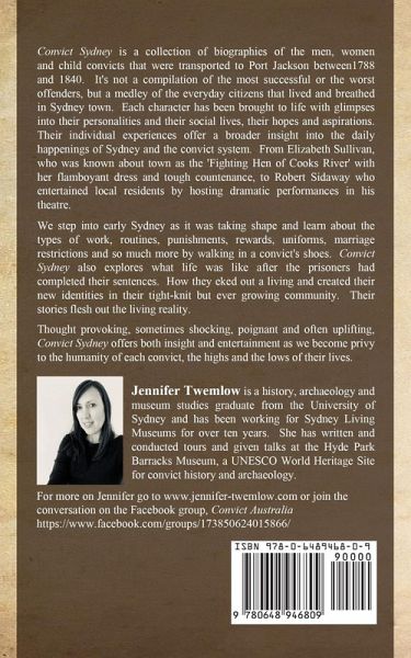 Convict Sydney is a collection of biographies of the men, women and child convicts that were transported to Port Jackson between 1788 and 1840. It's not a compilation of the most successful or the worst offenders, but a medley of the everyday citizens that lived and breathed in Sydney town. Each character has been brought to life with glimpses into their personalities and their social lives, their hopes and aspirations. Their individual experiences offer a broader insight into the daily happenings of Sydney and the convict system. From Elizabeth Sullivan, who was known about town as the 'Fighting Hen of Cooks River' with her flamboyant dress and tough countenance, to Robert Sidaway who entertained local residents by hosting dramatic performances in his theater. We step into early Sydney as it was taking shape and learn about the types of work, routines, punishments, rewards, uniforms, marriage restrictions and so much more by walking in a convict's shoes. Convict Sydney also explores what life was like after the prisoners had completed their sentences. How they eked out a living and created their new identities in their tight-knit but ever growing community. Their stories flesh out the living reality. Thought provoking, sometimes shocking, poignant and often uplifting, Convict Sydney offers both insight and entertainment as we become privy to the humanity of each convict, the highs and the lows of their lives