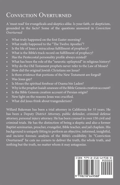 Forensic review of Bible, using traditional rules of evidence used in trial courts, by trial attorney, A 'must read' for evangelicals and skeptics alike. Is your faith, or skepticism, grounded in the facts? Some of the questions answered in Conviction Overturned: 1. What truly happened on the first Easter morning? 2. What really happened to the "The Twelve Apostles"? 3. Is the life of Jesus a miraculous fulfillment of prophecy? 4. What is the Bible's track record on fulfillment of prophecy? 5. Has the Pentecostal personality profile always existed? 6. What has been the role of the "neurotic-epileptoid" in religious history? 7. Why do the Old Testament prophets never refer to the Law of Moses? 8. How did the original Jewish Christians see Jesus? 9. Is there evidence that portions of the New Testament are forged? 10. Was Jesus gay? 11. Is Moses the spiritual forebear of Osama bin Laden? 12. Why is the prophet Isaiah unaware of the Bible Genesis creation account? 13. Is the Bible Genesis creation account of Persian origin? 14. New light on the reasons Jesus was crucified. 15. What did Jesus think about trangenderism? Willard Bakeman has been a trial attorney in California for 33 years. He has been a Deputy District Attorney, public defender, criminal defense attorney, personal injury attorney. He has been counsel in over 150 civil and criminal trials. He has the distinction of being a skeptic and also a former Baptist seminarian, preacher, evangelist, Bible teacher, and jail chaplain. His background is uniquely fitting to perform an objective, informed, insightful, and incisive forensic analysis of the Bible's credibility. In "Unimpeachable Verdict" he cuts no corners to deliver the truth, the whole truth, and nothing but the truth, no matter whom it may antagonize.