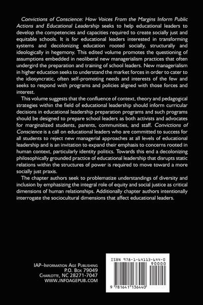 Convictions of Conscience: How Voices From the Margins Inform Public Actions and Educational Leadership seeks to help educational leaders to develop the competencies and capacities required to create socially just and equitable schools. It is for educational leaders interested in transforming systems and decolonizing education rooted socially, structurally and ideologically in hegemony. This edited volume promotes the questioning of assumptions embedded in neoliberal new managerialism practices that often undergird the preparation and training of school leaders. New managerialism in higher education seeks to understand the market forces in order to cater to the idiosyncratic, often self-promoting needs and interests of the few and seeks to respond with programs and policies aligned with those forces and interest. This volume suggests that the confluence of context, theory and pedagogical strategies within the field of educational leadership should inform curricular decisions in educational leadership preparation programs and such programs should be designed to prepare school leaders as both activists and advocates for marginalized students, parents, communities, and staff. Convictions of Conscience is a call on educational leaders who are committed to success for all students to reject new managerial approaches at all levels of educational leadership and is an invitation to expand their emphasis to concerns rooted in human context, particularly identity politics. Towards this end a decolonizing philosophically grounded practice of educational leadership that disrupts static relations within the structures of power is required to move toward a more socially just praxis. The chapter authors seek to problematize understandings of diversity and inclusion by emphasizing the integral role of equity and social justice as critical dimensions of human relationships. Additionally chapter authors intentionally interrogate the socio-cultural dimensions that affect educational leaders.