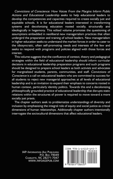 Convictions of Conscience: How Voices From the Margins Inform Public Actions and Educational Leadership seeks to help educational leaders to develop the competencies and capacities required to create socially just and equitable schools. It is for educational leaders interested in transforming systems and decolonizing education rooted socially, structurally and ideologically in hegemony. This edited volume promotes the questioning of assumptions embedded in neoliberal new managerialism practices that often undergird the preparation and training of school leaders. New managerialism in higher education seeks to understand the market forces in order to cater to the idiosyncratic, often self-promoting needs and interests of the few and seeks to respond with programs and policies aligned with those forces and interest. This volume suggests that the confluence of context, theory and pedagogical strategies within the field of educational leadership should inform curricular decisions in educational leadership preparation programs and such programs should be designed to prepare school leaders as both activists and advocates for marginalized students, parents, communities, and staff. Convictions of Conscience is a call on educational leaders who are committed to success for all students to reject new managerial approaches at all levels of educational leadership and is an invitation to expand their emphasis to concerns rooted in human context, particularly identity politics. Towards this end a decolonizing philosophically grounded practice of educational leadership that disrupts static relations within the structures of power is required to move toward a more socially just praxis. The chapter authors seek to problematize understandings of diversity and inclusion by emphasizing the integral role of equity and social justice as critical dimensions of human relationships. Additionally chapter authors intentionally interrogate the socio-cultural dimensions that affect educational leaders.