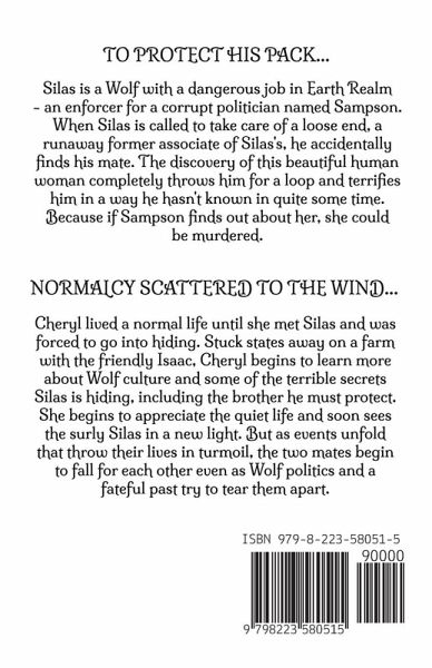 Silas is a Wolf with a dangerous job in Earth Realm - an enforcer for a corrupt politician named Sampson. When Silas is called to take care of a loose end, a runaway former associate of Silas's, he accidentally finds his mate. The discovery of this beautiful human woman completely throws him for a loop and terrifies him in a way he hasn't known in quite some time. Because if Sampson finds out about her, she could be murdered. Cheryl lived a normal life until she met Silas and was forced to go into hiding. Stuck states away on a farm with the friendly Isaac, Cheryl begins to learn more about Wolf culture and some of the terrible secrets Silas is hiding, including the brother he must protect. She begins to appreciate the quiet life and soon sees the surly Silas in a new light. But as events unfold that throw their lives in turmoil, the two mates begin to fall for each other even as Wolf politics and a fateful past try to tear them apart.