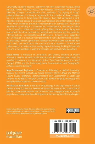 Chapter 1: Conviviality vis-à-vis Cosmopolitanism and Creolisation: Probing the concepts.- Chapter 2: Fantasy of conviviality: banalities of multicultural settings and what we do (not) notice when we look at them.- Chapter 3: Creolisation as a Recipe for Conviviality.- Chapter 4: Schleiermacher's Geselligkeit, Henriette Herz, and the 'Convivial Turn'.- Chapter 5: Cosmopolitanism as Utopia.- Chapter 6: Creolizing Conviviality: Thinking Relational Ontology and Decolonial Ethics through Ivan Illich and Édouard Glissant.- Chapter 7: A Convivial Journey: From Diversity in Istanbul to Solidarity with Refugees in Denmark.- Chapter 8: Bringing Conviviality into Methods in Media and Migration Studies:.- Chapter 9: Post-2015 Refugees Welcome Initiatives in Sweden: Cosmopolitan Underpinnings.- Chapter 10: The Bridge - Redux: The Breakdown of Normative Conviviality.- Chapter 11: Charting a Convivial Continuum in British Post-War Popular Music 1948-2018.- Chapter 12: Footballers and Conductors: Between Reclusiveness and Conviviality.- Chapter 13: Impurity and Danger. Excerpt from Cape Calypso.- Chapter 15: Seeing Johannesburg Anew: Conviviality and Opacity in Khalo Matabane's Conversations on a Sunday Afternoon.