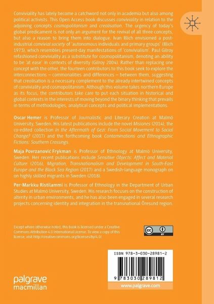 Chapter 1: Conviviality vis-à-vis Cosmopolitanism and Creolisation: Probing the concepts.- Chapter 2: Fantasy of conviviality: banalities of multicultural settings and what we do (not) notice when we look at them.- Chapter 3: Creolisation as a Recipe for Conviviality.- Chapter 4: Schleiermacher's Geselligkeit, Henriette Herz, and the 'Convivial Turn'.- Chapter 5: Cosmopolitanism as Utopia.- Chapter 6: Creolizing Conviviality: Thinking Relational Ontology and Decolonial Ethics through Ivan Illich and Édouard Glissant.- Chapter 7: A Convivial Journey: From Diversity in Istanbul to Solidarity with Refugees in Denmark.- Chapter 8: Bringing Conviviality into Methods in Media and Migration Studies:.- Chapter 9: Post-2015 Refugees Welcome Initiatives in Sweden: Cosmopolitan Underpinnings.- Chapter 10: The Bridge - Redux: The Breakdown of Normative Conviviality.- Chapter 11: Charting a Convivial Continuum in British Post-War Popular Music 1948-2018.- Chapter 12: Footballers and Conductors: Between Reclusiveness and Conviviality.- Chapter 13: Impurity and Danger. Excerpt from Cape Calypso.- Chapter 15: Seeing Johannesburg Anew: Conviviality and Opacity in Khalo Matabane's Conversations on a Sunday Afternoon.