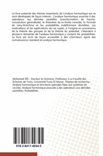Le livre présente des thèmes importants de l'analyse harmonique qui se sont développés de façon intense : L'analyse harmonique associée à des opérateurs aux dérivées partielles (transformation de Fourier, convolution généralisée), le théorème de la limite centrale, la formule de Lévy-Kintchine et les probabilités indéfiniment divisibles. Les motivations et les applications de ces sujets, à l'origine en provenance de la théorie des groupes et de la théorie du potentiel, s'étendent à plusieurs domaines de l'analyse harmonique y compris les probabilités. Le livre est écrit de façon accessible à des chercheurs ayant des connaissances standard en analyse harmonique.