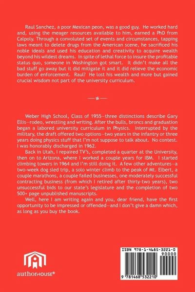 Bad stuff happens. It's all around us. Most of us don't like bad stuff. Let's get rid of all the bad stuff-then there will be just good stuff and we can all live happily in Utopia. Who's going to get rid of the bad stuff? Who else? Government! Of course! Just pass laws against bad stuff and it will all go away. Right? Wrong! You know better than that! The United States presently has the greatest percentage of its population behind bars than any country in the history of the world. (Don't take my word for it-look it up!) Those of us not behind bars should be the happiest people in the world, shouldn't we? Unfortunately, those behind bars, all the people who put them there and keep them there and all the people who make and administer the laws to do away with bad stuff, are all consumers-their contribution to the economy negative. When we add up all the jail-birds, cops, lawyers, bureaucrats, lazy whiners and politicians, we have more people riding the wagon than pulling it. Raul Sanchez, a poor Mexican peon, was a good guy. He worked hard and, using the meager resources available to him, earned a PhD from Calpoly. Through a convoluted set of events and circumstances, tapping laws meant to delete drugs from the American scene, he sacrificed his noble ideals and used his education and creativity to acquire wealth beyond his wildest dreams. What goes up must come down. In spite of lethal force to insure the profitable status quo, someone in Washington got smart. It didn't make all the bad stuff go away but it did mitigate it and it did relieve the economic burden of enforcement. Raul? He lost his wealth and more but gained wisdom not part of the university curriculum.