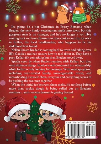 It's gonna be a hot Christmas in Frosty Bottoms, when Braden, the new hunky veterinarian strolls into town, but this gorgeous man is no stranger, and he's no longer a vet. He's coming back to Frosty Bottoms to bake cookies and dip his wick in Kellan, the local candlemaker, who happens to be his childhood best friend. Kellan knows Braden is coming back to town and taking over BJ's Cookies and he's unsure how to feel about it. They have a past; Kellan felt something but then Braden moved away. Sparks soon fly when Braden reunites with Kellan, but they want different things. Braden is only interested in a relationship, while Kellan is only looking for hookups. With mishaps galore, including over-excited family, unrecognizable otters, and motorboating a muscle chest, everyone and everything seems to be pushing the two men together. When the initial ice between them melts, it's not long before more than cookie dough is being rolled out on Braden's counters...and a certain bottom is getting frosted.