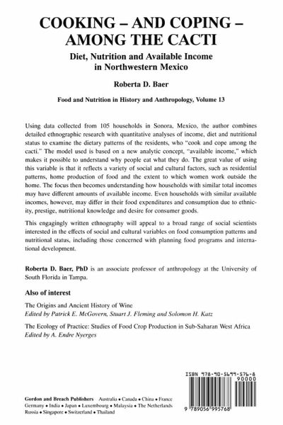 Using data collected from 105 households in Sonora, Mexico, the author combines detailed ethnographic research with quantitative analyses of income, diet, and nutritional status to examine the dietary patterns of residents who "cook and cope among the cacti." Employing a new analytical concept of "available income" - which can differ greatly from total income and provide valuable insight into why people eat what they do - the work explores a variety of social and cultural factors that affect food expenditure and consumption. Home production of food and the extent to which women are employed outside of the home are just two of the many variables discussed that influence available income and how it is used. But even among groups with similar available incomes, variables of ethnicity, prestige, nutritional knowledge, and the desire for consumer goods come into play.