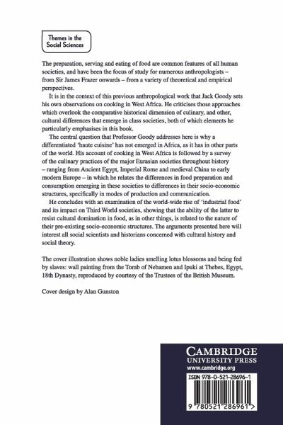 The preparation, serving and eating of food are common features of all human societies, and have been the focus of study for numerous anthropologists - from Sir James Frazer onwards - from a variety of theoretical and empirical perspectives. It is in the context of this previous anthropological work that Jack Goody sets his own observations on cooking in West Africa. He criticises those approaches which overlook the comparative historical dimension of culinary, and other, cultural differences that emerge in class societies, both of which elements he particularly emphasises in this book. The central question that Professor Goody addresses here is why a differentiated 'haute cuisine' has not emerged in Africa, as it has in other parts of the world. His account of cooking in West Africa is followed by a survey of the culinary practices of the major Eurasian societies throughout history - ranging from Ancient Egypt, Imperial Rome and medieval China to early modern Europe - in which he relates the differences in food preparation and consumption emerging in these societies to differences in their socio-economic structures, specifically in modes of production and communication. He concludes with an examination of the world-wide rise of 'industrial food' and its impact on Third World societies, showing that the ability of the latter to resist cultural domination in food, as in other things, is related to the nature of their pre-existing socio-economic structures. The arguments presented here will interest all social scientists and historians concerned with cultural history and social theory.