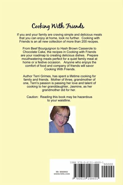 If you and your family are craving simple and delicious meals that you can enjoy at home, look no further. "Cooking with Friends" is an all new collection of more than 200 recipes. From Beef Bourguignon to Hash Brown Casserole to Chocolate Cake, the recipes in "Cooking with Friends" are your roadmap to creating delicious dishes. Prepare mouthwatering meals perfect for a quiet family meal at home or a festive occasion. Anyone who enjoys the comfort of food and company of friends will savor "Cooking With Friends". Author Terri Grimes, has spent a lifetime cooking for family and friends. Mother of three, grandmother of one, Terri's passion is passing her love and talent of cooking to her granddaughter, Jasmine, as her grandmother did for her. Caution: Reading this book may be hazardous to your waistline.