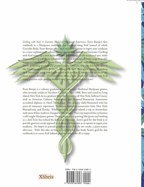 Cooking with Keif: A Gourmet Medicinal Marijuana Experience, Scott Bottjer's first cookbook is a Marijuana cookbook that explores using Keif instead of whole Cannabis Buds. Scott Bottjer offers new and tasty options to ingest your medicine in a more sophisticated, refined cuisine opposed to cookies and brownies. Cooking with Keif opens up a new realm of culinary knowledge to the medicinal user, while showcasing recipes for basic infusions with sauces and soups. Entrées range from old-fashioned Meatloaf and Brown Gravy to Chicken Roulade with a Lemmon Cream Sauce, promising to please any person's palate. Gourmet delicious delectable deserts like Tiramisu and Crème Brulee. Cooking with Keif offers a new caliber of cooking with Marijuana, using finer foods paired with medicinal benefits that eliminate the plant matter aftertaste. This cookbook offers a new concept of cooking with Keif using gourmet style cooking that will keep you coming back for more.