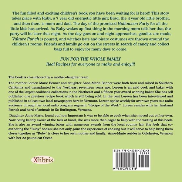 The book is coauthored by a mother-daughter team. The mother, Loreen Marie Benner, and daughter, Anne-Marie Benner, were both born and raised in Southern California and transplanted to the Northeast seventeen years ago. Loreen is an avid cook and baker with one of the largest cookbook collections in the Northeast and is a fifteen-year award winning baker. She has self-published one previous recipe book, which is still being sold. In the past, Loreen has been interviewed and published in at least two local newspapers here in Vermont. Loreen spoke weekly for over two years to a radio audience through her local radio program segment, "Recipe of the Week." Loreen resides with her husband, Patrick, and herd of animals in South Burlington, Vermont. The daughter, Anne-Marie, found out how important it was to be able to cook when she moved out on her own. Now being keenly aware of the task at hand, she was more than eager to help with the writing of this book. She is also an award-winning baker with numerous awards from the local country fair. She feels that coauthoring the "Ruby" book/s, she not only gains the experience of cooking, but it will serve to help bring them closer together as "Ruby" is close to her own mother and family. Anne-Marie resides in Colchester, Vermont with her twenty-two-pound cat, Oscar.