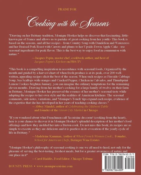 All about : Cooking With The Seasons : A Year In My Kitchen By Monique Jamet Hooker and Tracie Richardson This very personal culinary narrative cookbook is meant to help you learn to prepare meals using fresh, seasonal ingredients grown in your geographical area, whatever your level of expertise in the kitchen. It is also meant to entertain the casual reader with the experiences I shared with nine brothers and sisters while growing up on my family's 17th century chateau farm in France. Over 200 recipes are included in the book, all inspired by the dishes and techniques I grew up with in Europe. At the same time the recipes are uniquely American because they call for a wide range of ingredients easily available to us here in the United States. The recipes are seasonally based month by month to encourage cooks to learn about and use foods grown regionally. A convenient, easy to read harvest chart individually detailing the peak times for fresh produce in five growing regions of the United States is included. Following this chart makes understanding local growing seasons easy, and helps you understand when foods shipped from different parts of the country to their neighborhood market are at their flavorful best. The recipes I've created are beautiful to look at and simple to prepare, using basic cooking techniques. They play on seasonal characteristics of taste, texture and color, and are meant to spark the imagination and encourage your own creativity in the kitchen. Cooking With The Seasons: A Year In My Kitchen is also the story of how families can enjoy the seasonal market by celebrations at the table. Taking that little extra moment to share, whether it's during a large holiday dinner or at a picnic enjoying the best of summer's bounty, is what binds us together. There are many ways of gathering around food. Let me show you how by telling of my childhood in Brittany through stories and recipes that celebrate the best food America has to offer each season. My family's daily life may seem to speak with the voice of another era, but it is only the echo of the joy I continue to find through sharing meals today. By bringing the seasons into the kitchen I know you, too, will soon find your own joy inviting family and friends to the table. à bientôt and Bon Appétit Monique