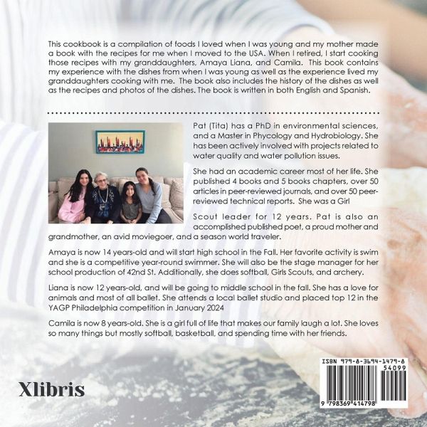 This cook book is a compilation of foods I loved when I was young and my mother made a book with the recipes for me when I moved to the USA. When I retired, I start cooking those recipes with my granddaughters, Amaya Liana, and Camila. This book contains my experience with the dishes from when I was young as well as the experience lived my granddaughters cooking with me. The book also includes the history of the dishes as well as the recipes and photos of the dishes. The book is written in both English and Spanish.