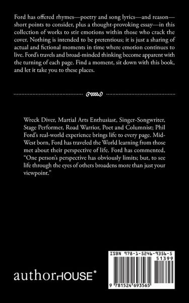 Ford has offered rhymes-poetry and song lyrics-and reason-short points to consider, plus a thought-provoking essay-in this collection of works to stir emotions within those who crack the cover. Nothing is intended to be pretentious; it is just a sharing of actual and fictional moments in time where emotion continues to live. Ford's travels and broad-minded thinking become apparent with the turning of each page. Find a moment, sit down with this book, and let it take you to these places.