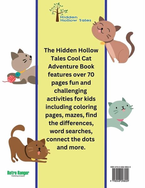 Young kids will love the Hidden Hollow Tales Cool Cat Adventure Book. A cat lovers delight filled with games and activities that will excite, inspire, and delight kid from 4-6 or older. This book features:Mazes Coloring Pages Matching ImagesCo Connect the Dots How to Draw Practice sheets Creating Your Own Puppet Theater and more.... For children, the Halloween Activity Book provides hours of fun and creative entertainment. For adults, activity books can:Teach Problem Solving Techniques Develop Fine Motor Skills Improve Concentration Help kids exercise creativity and cognitive skills