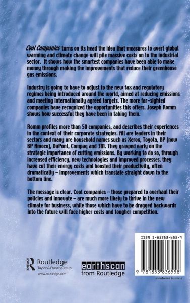 'Cool Companies' turns on its head the idea that measures to avert global warming and climate change will pile massive costs on to the industrial sector. It shows how the smartest companies have been able to make money through the improvements that reduce their greenhouse gas emissions. Industry is going to have to adjust to the new tax and regulatory regimes being introduced around the world, aimed at reducing emissions and meeting internationally agreed targets. The more far-sighted companies have recognised the opportunities this offers. Joseph Romm shows how successful they have been in taking them. Romm profiles more than 50 companies, and describes their experiences in the context of their corporate strategies. All are leaders in their sectors and many are household names such as Xerox, Toyota, BP (now BP Amoco), DuPont, Compaq and 3M. They grasped early on the strategic importance of cutting emissions. By working to do so, through increased efficiency, new technologies and improved processes, they have cut their energy costs and boosted their productivity, often dramatically - improvements which translate straight down to the bottom line. The message is clear. Cool Companies - those prepared to overhaul their policies and innovate - are much more likely to thrive in the new climate for business, while those which have to be dragged backwards into the future will face higher costs and tougher competition.
