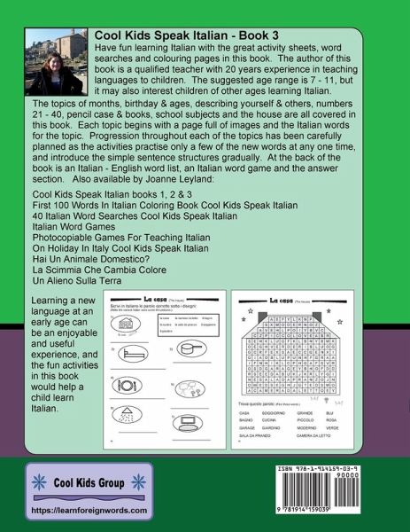Have fun learning Italian with the great activity sheets, word searches and colouring pages in this book. The author of this book is a qualified teacher with 20 years experience in teaching languages to children. The suggested age range is 7 - 11, but it may also interest children of other ages learning Italian. The topics of months, birthday & ages, describing yourself & others, numbers 21 - 40, pencil case & books, school subjects and the house are all covered in this book. Each topic begins with a page full of images and the Italian words for the topic. Progression throughout each of the topics has been carefully planned as the activities practise only a few of the new words at any one time, and introduce the simple sentence structures gradually. At the back of the book is an Italian - English word list, an Italian word game and the answer section. Also available by Joanne Leyland:Cool Kids Speak Italian books 1, 2 & 3 First 100 Words In Italian Coloring Book Cool Kids Speak Italian 40 Italian Word Searches Cool Kids Speak Italian Italian Word Games Photocopiable Games For Teaching Italian On Holiday In Italy Cool Kids Speak Italian Hai Un Animale Domestico? La Scimmia Che Cambia Colore Un Alieno Sulla Terra