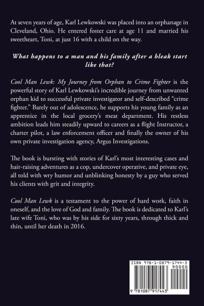 At seven years of age, Karl Lewkowski was placed into an orphanage in Cleveland, Ohio. He entered foster care at age 11 and married his sweetheart, Toni, at just 16 with a child on the way. What happens to a man and his family after a bleak start like that? Cool Man Lewk: My Journey from Orphan to Crime Fighter is the powerful story of Karl Lewkowski's incredible journey from unwanted orphan kid to successful private investigator and self-described "crime fighter." Barely out of adolescence, he supports his young family as an apprentice in the local grocery's meat department. His restless ambition leads him steadily upward to careers as a flight Instructor, a charter pilot, a law enforcement officer and finally the owner of his own private investigation agency, Argus Investigations. The book is bursting with stories of Karl's most interesting cases and hair-raising adventures as a cop, undercover operative, and private eye, all told with wry humor and unblinking honesty by a guy who served his clients with grit and integrity. Cool Man Lewk is a testament to the power of hard work, faith in oneself, and the love of God and family. The book is dedicated to Karl's late wife Toni, who was by his side for sixty years, through thick and thin, until her death in 2016.