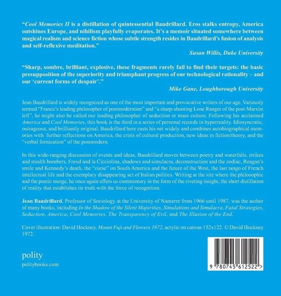 Jean Baudrillard is widely recognized as one of the most important and provocative writers of our age. This book is the third (after his acclaimed America and Cool Memories) in a series of personal records in hyper-reality. Here Baudrillard casts his net widely and brings in autobiographical memories and further reflections on America, the crisis of cultural production, new ideas in fiction-theory, and the "verbal fornication" of the postmodern. His wide-ranging discussion of events and their relationship to theory moves between poetry and waterfalls, strikes and Stealth bombers, Freud and la Cicciolina, shadows and simulacra, deconstruction and the zodiac, Reagan's smile and Kennedy's death, the "curse" on South America and the future of the West, the last tango of French intellectual life and the exemplary disappearing act of Italian politics. Idiosyncratic, outrageous, brilliantly original, Cool Memories II will be required reading by anyone concerned with the debates about postmodernism and the current state of theory on the social sciences and humanities.