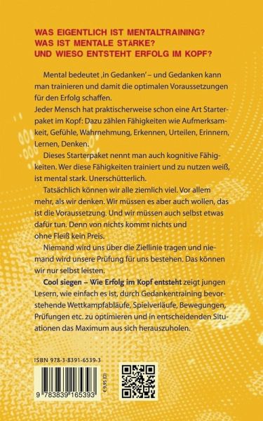 Was eigentlich ist Mentaltraining? Was ist mentale Stärke? Und wieso entsteht Erfolg im Kopf?Mental bedeutet in Gedanken und diese kann man auch trainieren und damit die optimalen Voraussetzungen für den Erfolg schaffen. Cool siegen - Wie Erfolg im Kopf entsteht'zeigt jungen Lesern, wie einfach es ist, durch Gedankentraining bevorstehende Wettkämpfe, Spielverläufe, Bewegungen, Prüfungen etc. zu optimieren und in entscheidenden Situationen das Maximum aus sich heraus zu holen.