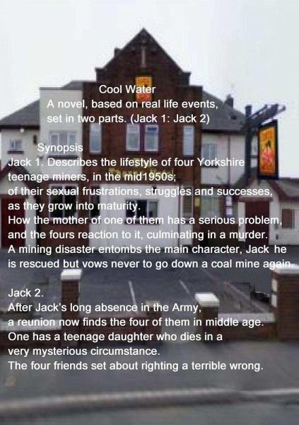 Cool Water Jack Gale A novel, based on real places, real people and real life events, set in two parts. (Jack 1: Jack 2) Synopsis Jack 1. Describes the lifestyle of four Yorkshire teenage miners in the mid1950s; of their sexual frustrations, struggles and successes, as they grow into maturity. How the mother of one of them has a very serious problem, and the fours reaction to it, culminating in a murder. A mining disaster entombs the main character, Jack. He is rescued but vows never to go down a coal mine again. Jack 2. After Jack's long absence in the Army, a reunion now finds the four of them in middle age. One has a teenage daughter who dies in a very mysterious circumstance. The four friends set about righting a terrible wrong.