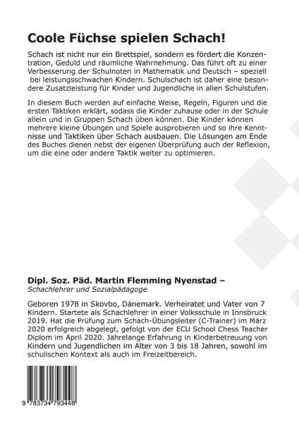 Coole Füchse spielen Schach!Schach ist nicht nur ein Brettspiel, sondern es fördert die Konzentration, Geduld und räumliche Wahrnehmung. Das führt oft zu einer Verbesserung der Schulnoten in Mathematik und Deutsch - speziell bei leistungsschwachen Kindern. Schulschach ist daher eine besondere Zusatzleistung für Kinder und Jugendliche in allen Schulstufen.In diesem Buch werden auf einfache Weise, Regeln, Figuren und die ersten Taktiken erklärt, sodass die Kinder zuhause oder in der Schule allein und in Gruppen Schach üben können. Die Kinder können mehrere kleine Übungen und Spiele ausprobieren und so ihre Kenntnisse und Taktiken über Schach ausbauen. Die Lösungen am Ende des Buches dienen nebst der eigenen Überprüfung auch der Reflexion, um die eine oder andere Taktik weiter zu optimieren.