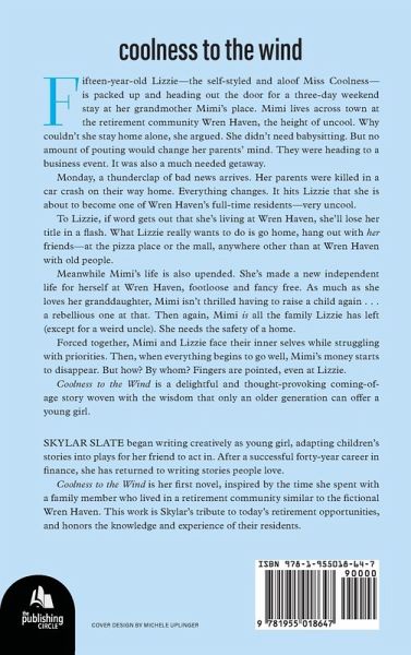Fifteen-year-old Lizzie-the self-styled and aloof Miss Coolness-is packed up and heading out the door for a three-day weekend stay at her grandmother Mimi's place. Mimi lives in another town at the retirement community Wren Haven . . . the height of uncool. Why couldn't she stay home alone, she argued. She didn't need babysitting. But no amount of pouting would change her parents' minds. They were heading to a business event. It was also a much needed getaway. Monday, a thunderclap of bad news arrives. Her parents were killed in a car crash on their way home. Everything changes. It hits Lizzie that she is about to become one of Wren Haven's full-time residents-very uncool. To Lizzie, if word gets out that she's living at Wren Haven, she'll lose her title in a flash. What Lizzie really wants to do is go home, hang out with her friends-at the pizza place or the mall, anywhere other than at Wren Haven with old people. Meanwhile, Mimi's life is also upended. She's made a new independent life for herself at Wren Haven, footloose and fancy free. As much as she loves her granddaughter, Mimi isn't thrilled having to raise a child again . . . a rebellious one at that. Then again, Mimi is all the family Lizzie has left (except for a weird uncle). She needs the safety of a home. Forced together, Mimi and Lizzie face their inner selves while struggling with priorities. Then, when everything begins to go well, Mimi's money starts to disappear. But how? By whom? Fingers are pointed, even at Lizzie. Coolness to the Wind is a delightful and thought-provoking coming-of-age story woven with the wisdom that only an older generation can offer a young girl.