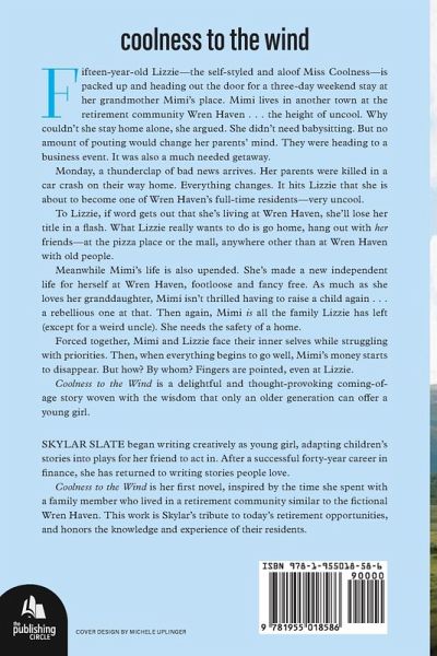 Fifteen-year-old Lizzie-the self-styled and aloof Miss Coolness-is packed up and heading out the door for a three-day weekend stay at her grandmother Mimi's place. Mimi lives in another town at the retirement community Wren Haven . . . the height of uncool. Why couldn't she stay home alone, she argued. She didn't need babysitting. But no amount of pouting would change her parents' minds. They were heading to a business event. It was also a much needed getaway. Monday, a thunderclap of bad news arrives. Her parents were killed in a car crash on their way home. Everything changes. It hits Lizzie that she is about to become one of Wren Haven's full-time residents-very uncool. To Lizzie, if word gets out that she's living at Wren Haven, she'll lose her title in a flash. What Lizzie really wants to do is go home, hang out with her friends-at the pizza place or the mall, anywhere other than at Wren Haven with old people. Meanwhile, Mimi's life is also upended. She's made a new independent life for herself at Wren Haven, footloose and fancy free. As much as she loves her granddaughter, Mimi isn't thrilled having to raise a child again . . . a rebellious one at that. Then again, Mimi is all the family Lizzie has left (except for a weird uncle). She needs the safety of a home. Forced together, Mimi and Lizzie face their inner selves while struggling with priorities. Then, when everything begins to go well, Mimi's money starts to disappear. But how? By whom? Fingers are pointed, even at Lizzie. Coolness to the Wind is a delightful and thought-provoking coming-of-age story woven with the wisdom that only an older generation can offer a young girl.
