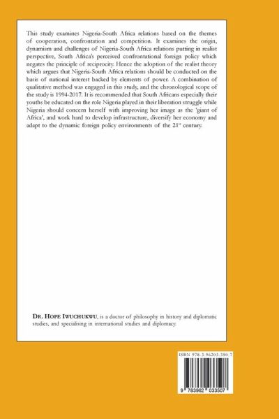 This study examines Nigeria-South Africa relations based on the themes of cooperation, confrontation and competition. It examines the origin, dynamism and challenges of Nigeria-South Africa relations putting in realist perspective, South Africa's perceived confrontational foreign policy which negates the principle of reciprocity. Hence the adoption of the realist theory which argues that Nigeria-South Africa relations should be conducted on the basis of national interest backed by elements of power. A combination of qualitative method was engaged in this study, and the chronological scope of the study is 1994-2017. It is recommended that South Africans especially their youths be educated on the role Nigeria played in their liberation struggle while Nigeria should concern herself with improving her image as the 'giant of Africa', and work hard to develop infrastructure, diversify her economy and adapt to the dynamic foreign policy environments of the 21st century.
