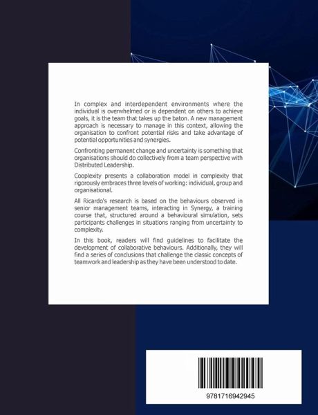 In complex and interdependent environments where the individual is overwhelmed or is dependent on others to achieve goals, it is the team that takes up the baton. A new management approach is necessary for this context, allowing the organisation to confront potential risks and take advantage of opportunities and synergies. Confronting permanent change and uncertainty is something that organisations should do collectively from a team perspective with Distributed Leadership. Cooplexity presents a collaboration model in complexity that rigorously embraces three levels of working: individual, group and organisational. Ricardo's research is based on the behaviours observed in senior management teams interacting in Synergy, a training course structured around a behavioural simulation that sets participants' challenges in situations ranging from uncertainty to complexity. In this book, readers will find guidelines to facilitate the development of collaborative behaviours. Additionally, they will find a series of conclusions that challenge the classic concepts of teamwork and leadership as they have been understood to date.