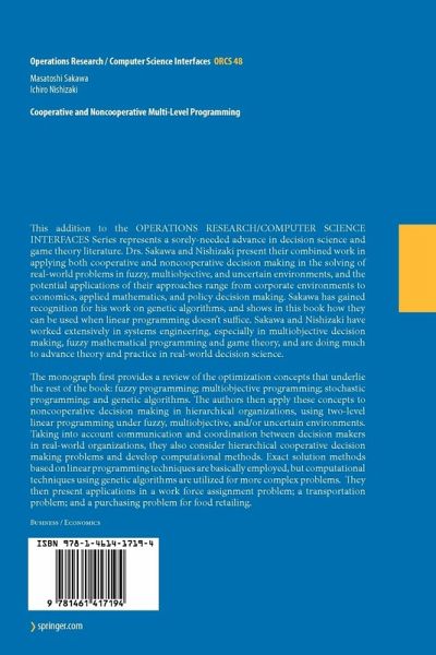 Masatoshi Sakawa was born in Matsuyama, Japan on 11 August 1947. He received B.E., M.E., and D.E. degrees in applied mathematics and physics at Kyoto University in 1970, 1972, and 1975, respectively. From 1975 he was with Kobe University where, since 1981, he was an Associate Professor in the Department of Systems Engineering. From 1987 to 1990 he was a Professor in the Department of Computer Science at Iwate University. At present he is a Professor at Hiroshima University and is working with the Department of Artificial Complex Systems Engineering in the Graduate School of Engineering. He was an Honorary Visiting Professor at University of Manchester Institute of Science and Technology (UMIST), Computation Department, sponsored by the Japan Society for the Promotion of Science (JSPS) from March to December 1991. He was also a Visiting Professor at the Kyoto Institute of Economic Research, Kyoto University from April 1991 to March 1992. His research and teaching activities are in the area of systems engineering, especially mathematical optimization, multiobjective decision making, fuzzy mathematical programming and game theory. In addition to over 300 articles in National and International Journals, he is an author and coauthor of 5 books in English and 14 books in Japanese, including the Springer titles Genetic Algorithms and Fuzzy Multiobjective Optimization; Fuzzy Sets and Interactive Multiobject Optimization; Large-Scale Interactive Fuzzy Multiobjective Programming: Decomposition Approaches; and, with Nishizaki, Fuzzy and Multiobjective Games for Conflict Resolution. Ichiro Nishizaki was born in Osaka, Japan, in January, 1959. He received B.E. and M.E. degrees in systems engineering at Kobe University in 1982 and 1984, respectively, and he received the D.E. degree from Hiroshima University in 1993. From 1984 to 1990, he worked for Nippon Steel Corporation. From 1990 to 1993, he was a Research Associateat the Kyoto Institute of Economic Research, Kyoto University. From 1993 to 1996, he was an Associate Professor in the Faculty of Business Administration and Informatics at Setsunan University. From 1997 to 2001, he was an Associate Professor at Hiroshima University, and was working with the Department of Artificial Complex Systems Engineering in the Graduate School of Engineering. At present, he is a Professor in that department. His research and teaching activities are in the area of systems engineering, especially game theory, multiobjective decision making, and fuzzy mathematical programming. He is an author or coauthor of about eighty papers, one book in English (Springer: Fuzzy and Multiobjective Games for Conflict Resolution), and two books in Japanese.