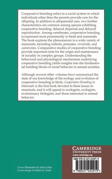 Cooperative breeding refers to a social system in which individuals other than the parents provide care for the offspring. In addition to alloparental care, two further characteristics are common among species exhibiting cooperative breeding: delayed dispersal and delayed reproduction. Among vertebrates, cooperative breeding is expressed most prominently in birds and mammals. The book explores the phenomenon in a wide variety of mammals, including rodents, primates, viverrids, and carnivores. Comparative studies of cooperative breeding provide important tests for the origin and maintenance of sociality in complex groups. Understanding the behavioral and physiological mechanisms underlying cooperative breeding yields insights into the fundamental building blocks of social behavior in animal societies. Although several recent volumes have summarized the state of our knowledge of the ecology and evolution of cooperative breeding in birds, Cooperative Breeding in Mammals is the first book devoted to these issues in mammals, and it will appeal to zoologists, ecologists, evolutionary biologists, and those interested in animal behavior.
