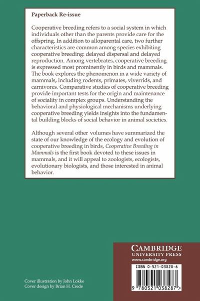 Cooperative breeding refers to a social system in which individuals other than the parents provide care for the offspring. Since individuals delay breeding and invest in the offspring of others, cooperative breeding poses a challenge to a Darwinian explanation of the evolution of social behaviour. The contributors to this book explore the evolutionary, ecological, behavioural and physiological basis of cooperative breeding in mammals. The book contains a collection of chapters by the leading researchers in the field, and it is the first book dedicated exclusively to the study of mammalian cooperative breeding. It will appeal to zoologists, ecologists, evolutionary biologists, and to those interested in animal behaviour.